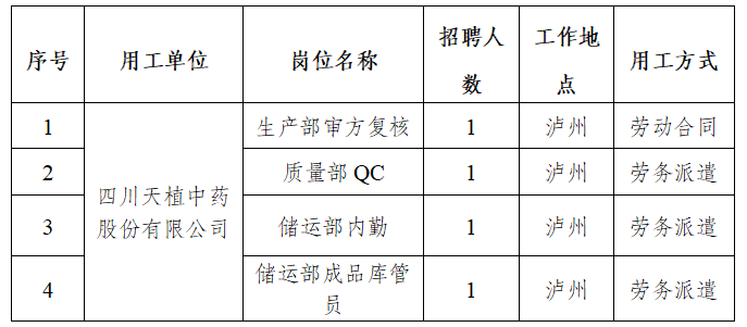 详见附件《四川天植中药股份有限公司2024年公开招聘岗位需求表》(附件1)。